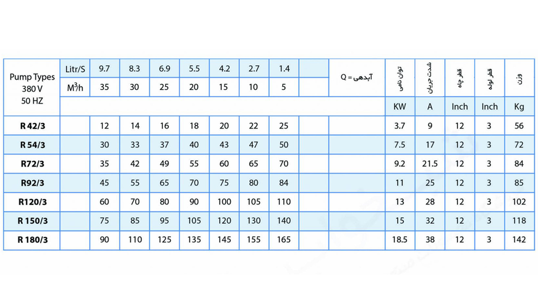 جدول مشخصات کفکش های 3 اینچ سه فاز رهاب پمپ