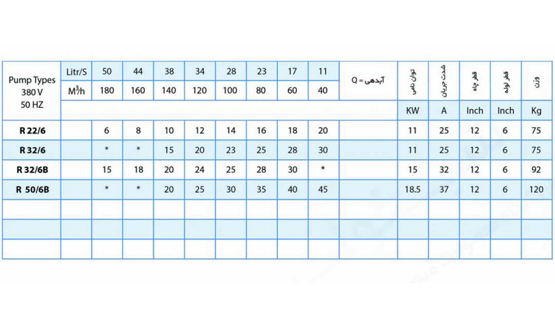 جدول مشخصات کفکش های شش اینچ سه فاز رهاب پمپ
