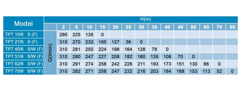 پمپ های کفکش توان تک در دو مدل خروجی بالا با پیشوند TPT و خروجی بغل با پیشوند TMR می باشد.
